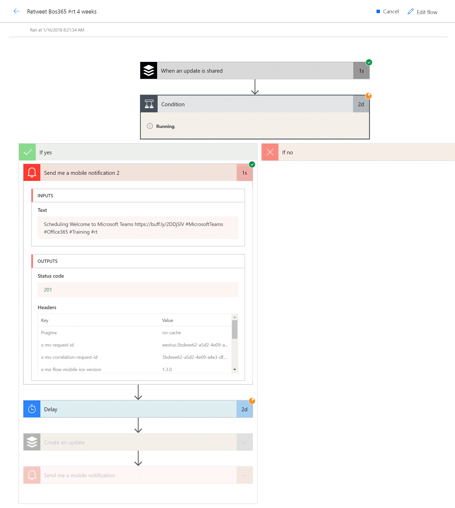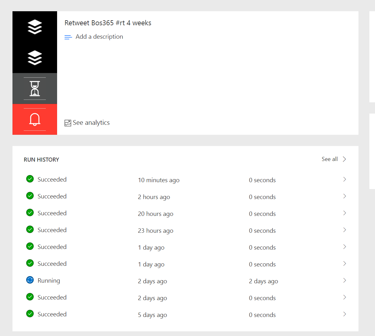 Secondly, check the status! When this Flow runs and finds a tweet update with #rt, the Flow remains in a Running state until it’s finished. Note the one lonely Running in the history list