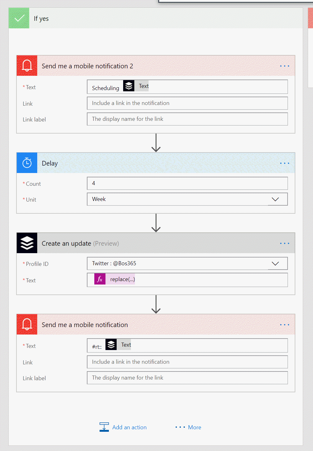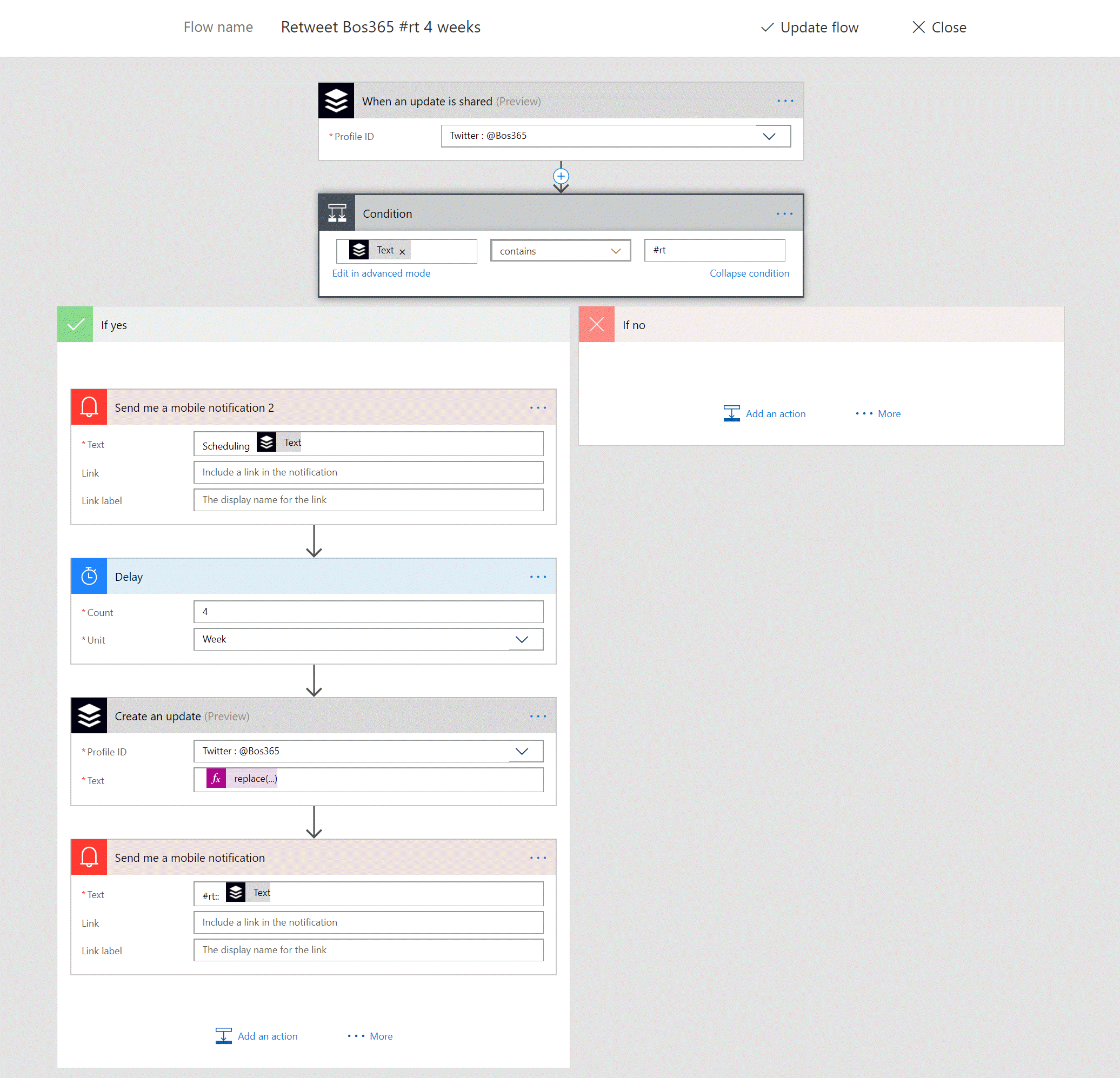 To sum up, it triggers when a tweet is sent via Buffer. It checks if the tweet contains #rt, if so, it waits 4 weeks and retweets the same tweet without the #rt.