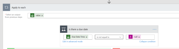 Add a condition, and add the Due Date Time field from the List Tasks action, and BLAM you’ll have the Apply to Each added automatically.