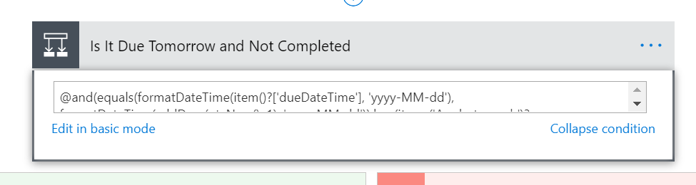 We have an and() which says each condition in this has to be true. It looks like and(1,2). Our first and statement is checking if the due date is equal to tomorrow: equals(formatDateTime(item()?['dueDateTime'], 'yyyy-MM-dd'), formatDateTime(addDays(utcNow(), 1), 'yyyy-MM-dd')). The second and statement is check if the percent complete field is less than 100 (since it sets to 100 when someone marks a task complete): less(items('Apply_to_each')?['percentComplete'], 100).