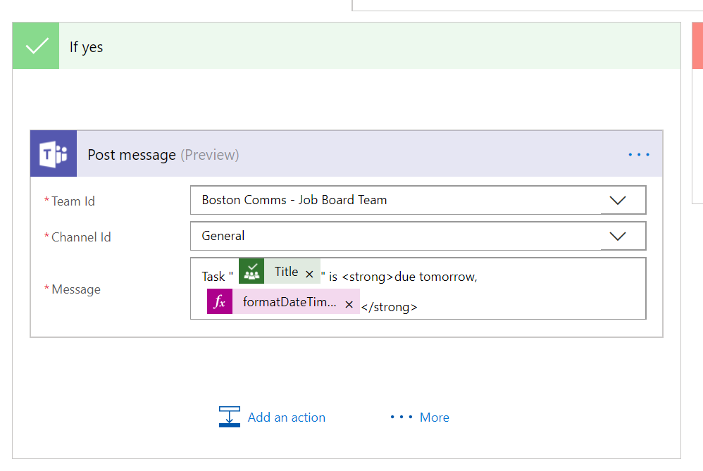 This Flow I feel like should be unnecessary, but alas it is. The simple idea is to have tasks which are due tomorrow post to your team to help keep people up to date. Planner does offer email notifications which can do the same, they work great, BUT our users disable notifications because they are too verbose at the moment (i.e. getting emails on comments on tasks). We still want to notify the team of the impending tasks, however.