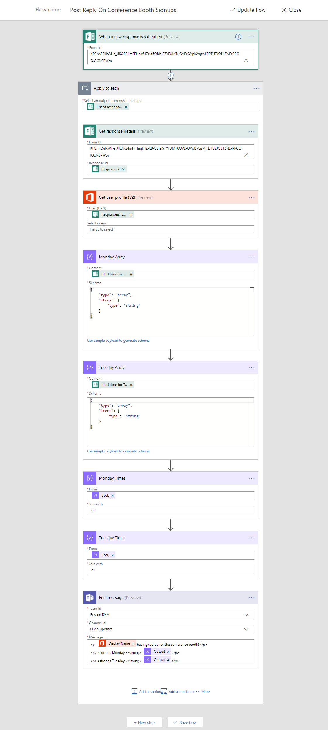 These selected values get saved as a string, in a JSON array format, like ["10a-12p","2p-4p"]. If this doesn’t make sense, that’s okay. That string value is actually a multi-value array, just in a single string format. These next two actions, Monday Array and and Tuesday Array convert this string value into an array object for us to work with.