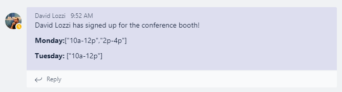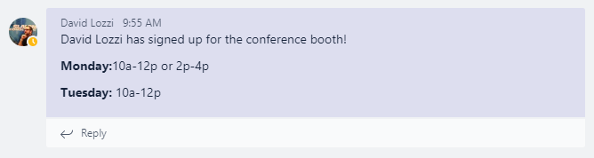 <p> [Display Name from Office 365 Users action] has signed up for the conference booth!</p>