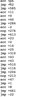 Somewhere in the program, either a jmp is supposed to be a nop, or a nop is supposed to be a jmp. (No acc instructions were harmed in the corruption of this boot code.)” ref