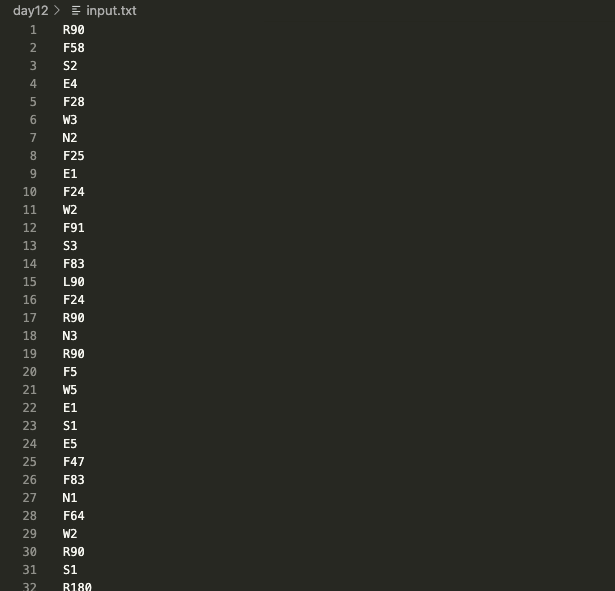 “The navigation instructions (your puzzle input) consists of a sequence of single-character actions paired with integer input values. After staring at them for a few minutes, you work out what they probably mean. The ship starts by facing east. Only the L and R actions change the direction the ship is facing. (That is, if the ship is facing east and the next instruction is N10, the ship would move north 10 units, but would still move east if the following action were F.)