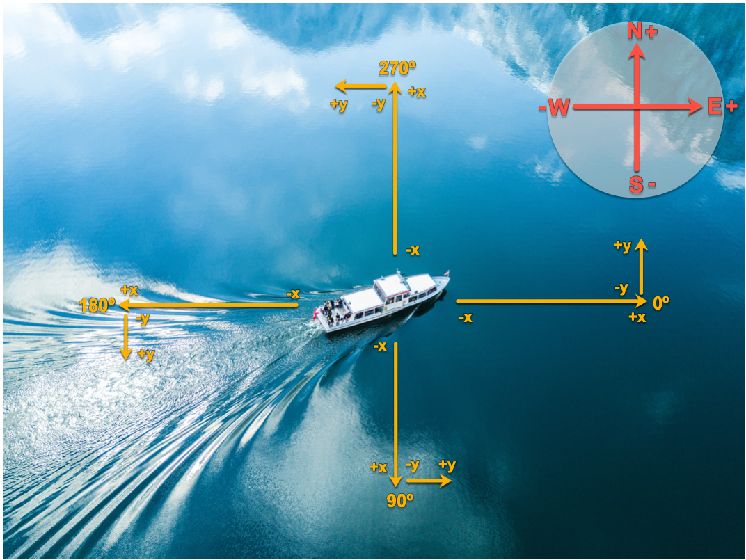 Note the + and - in each direction, we’ll touch upon those shortly. I set up some variables to track the location of our boat: