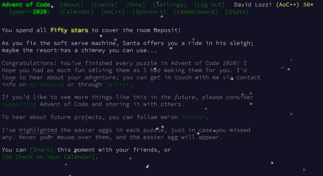 There was none! It was a Christmas miracle. Actually, to solve part 2, I needed 49 stars, all stars from all of the other puzzles. If you’ve been following along, you’ll notice I skipped a day or two. I had to go back and work on those to get my 49 stars, then finally: