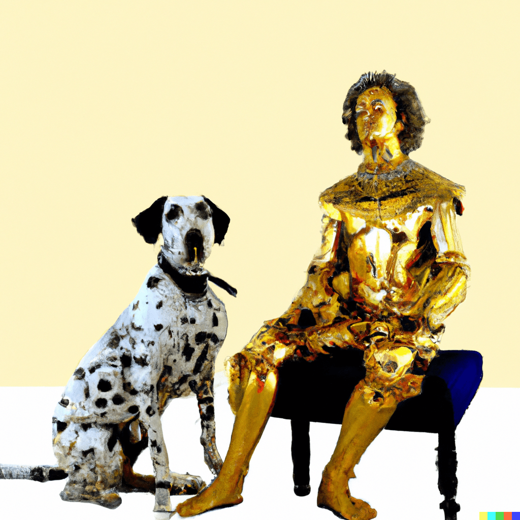 The image above was generated from DALL-E 2: “a Baroque painting of a gold shiny robot sitting next to a person with a Dalmatian”